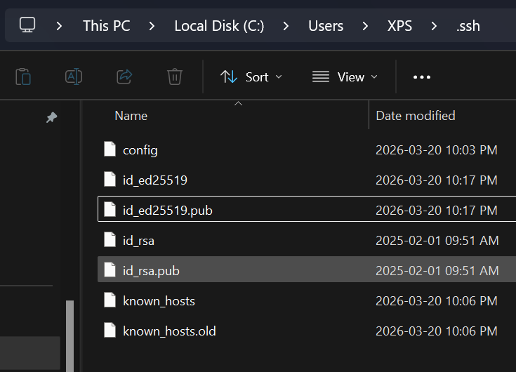 1- Create the ssh keys in local manchine(my XPS13): id_ed25519.pub and id_ed25519 files.